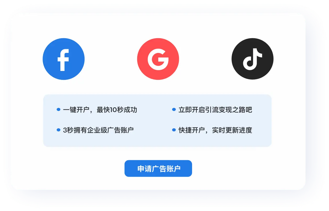极速开户,目前提供谷歌广告、Facebook、TikTok在内的广告账户开通。